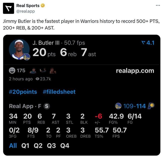 全场巴特勒高效砍下20分6板7助3断2帽,加入勇士以来仅用37场就拿到688分204板210次助攻,成为勇士队史达成500分200板200助攻最快的球员。