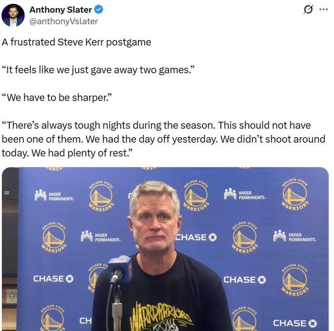 值得一提的是,在前一场勇士队不敌残阵雄鹿后,科尔就曾公开用讽刺的口吻批评球队,表示当勇士队面对缺少主力的球队时,战绩差不多是0胜12负,以后对手面对勇士时都要轮休主力了。