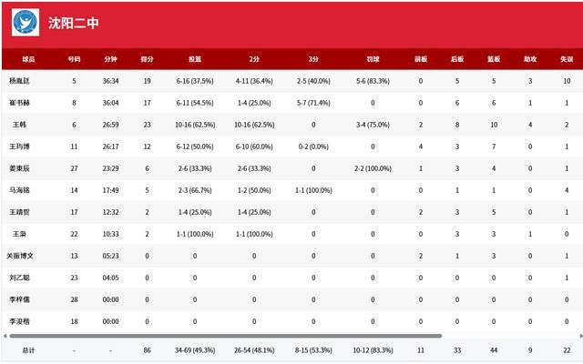 沈阳二中已经很棒了,此役命中率达到49.3%,远超广东队的44.4%,可惜出手次数太少。全队4人得分上双,王韩23分10篮板4助攻,崔书赫17分6篮板,杨胤廷19分5篮板3助攻10失误,王玙博12分7篮板。